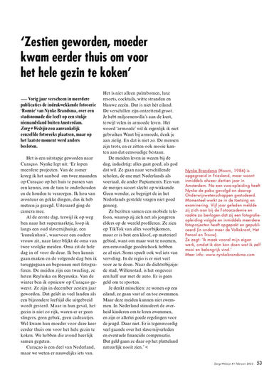 During my stay on Bandabou, the quiet side of the island of Curacao in the summer of 2022, I passed a small white house. Two young girls sat in front of the house. Sisters. Twins. They were my neighbours. I became curious. Who are they? What do they do? I asked them to be portrayed and became captivated by the intimate bond between the sisters. A bond that touched on my own desire for sisterly love. In them I saw the power of each other's support during an important and formative period in life.